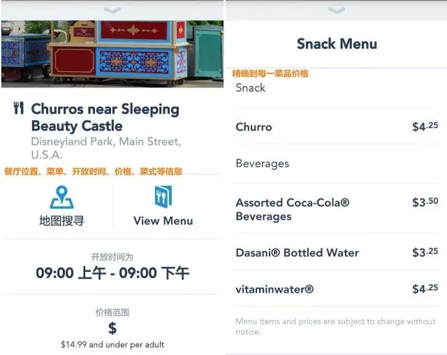 圖7:DisneylandApp餐館信息(包括餐廳位置、菜單、開放時間、價格、菜式等);以及菜單菜價