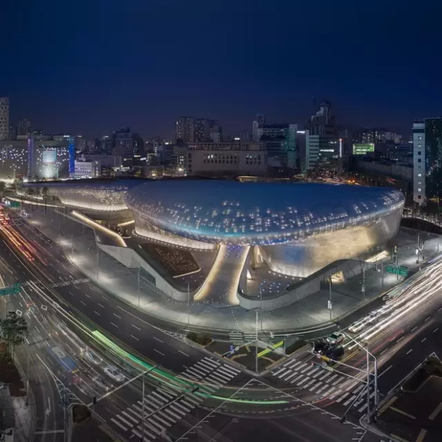 由扎哈·哈迪德操刀的東大門設(shè)計(jì)廣場(chǎng)及公園基地原為舉辦高中棒球賽的東大門運(yùn)動(dòng)場(chǎng),現(xiàn)把東大門的歷史及文化整合,將現(xiàn)存建筑及周遭的城市環(huán)境和諧地融合起來。該項(xiàng)目?jī)?nèi)有博物館、展覽室、常設(shè)服裝表演場(chǎng)、設(shè)計(jì)實(shí)驗(yàn)室、創(chuàng)意市場(chǎng)和東大門歷史文化公園,一貫哈迪德的流線型建筑,旁邊還有綠化市區(qū)的公園等。