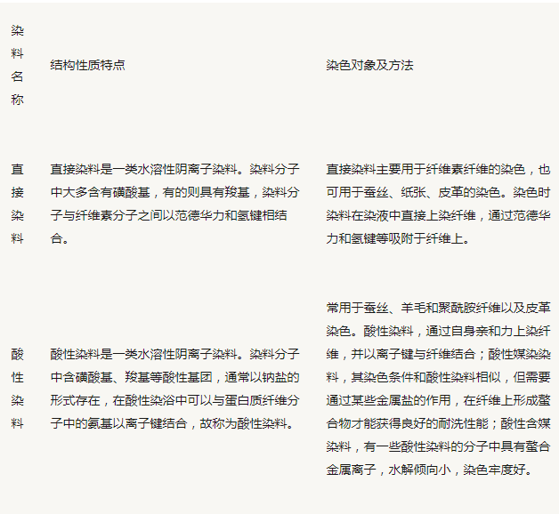 分為:偶氮染料、蒽醌染料、芳甲烷染料、靛族染料、硫化染料、酞菁染料、硝基和亞硝基染料,此外還有其他結(jié)構(gòu)類(lèi)型的染料,如甲川和多甲川類(lèi)染料、二苯乙烯類(lèi)染料以及各種雜環(huán)類(lèi)染料等。